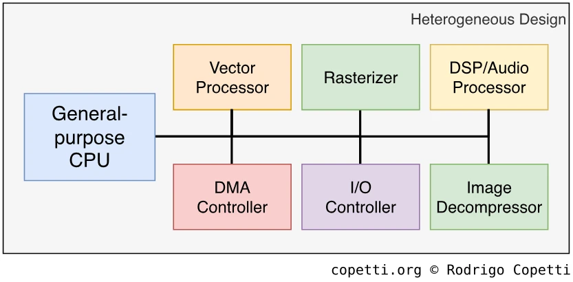 Пример гетерогенного дизайна. По сей день это де-факто архитектура многих мощных консолей.Пример гомогенного дизайна. Каждое ядро могло выполнять те же задачи, что и раньше. Они не обязательно ограничены одной задачей.
