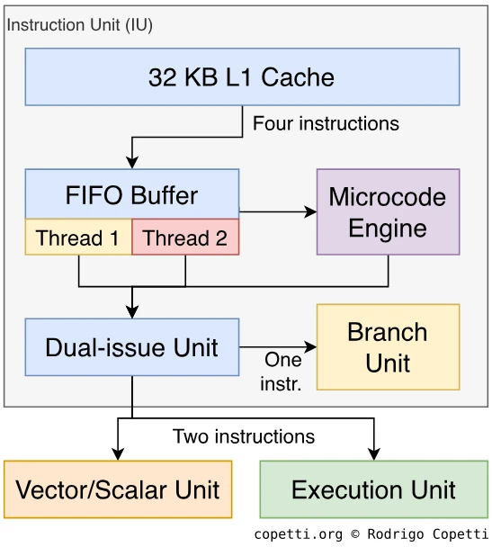 Теперь самое интересное: IU имеет “двойную обработку” (dual-issue): в некоторых случаях IU может обработать до двух инструкций за такт, что значительно повышает пропускную способность. На практике, однако, существует множество условий для того, чтобы это работало, поэтому программисты или компиляторы отвечают за оптимизацию своих процедур, чтобы их последовательность инструкций могла использовать преимущества этой функции. Кстати, двойная обработка реализована и в предыдущих процессорах, и этот термин может различаться между производителями. Поэтому я использовал определение от IBM.