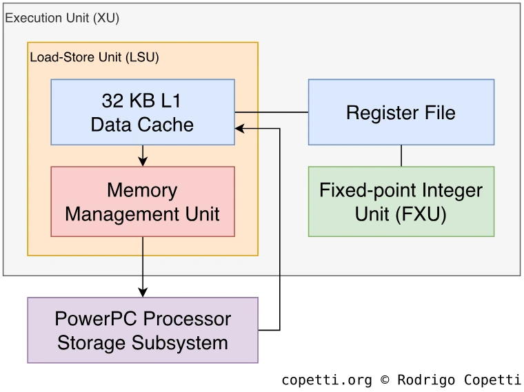Если вы посмотрите на диаграмму, вы увидите, что FXU, LSU и MMU объединены в один блок под названием исполнительный блок (Execution Unit, XU). Это потому, что они имеют один и тот же регистровый файл.