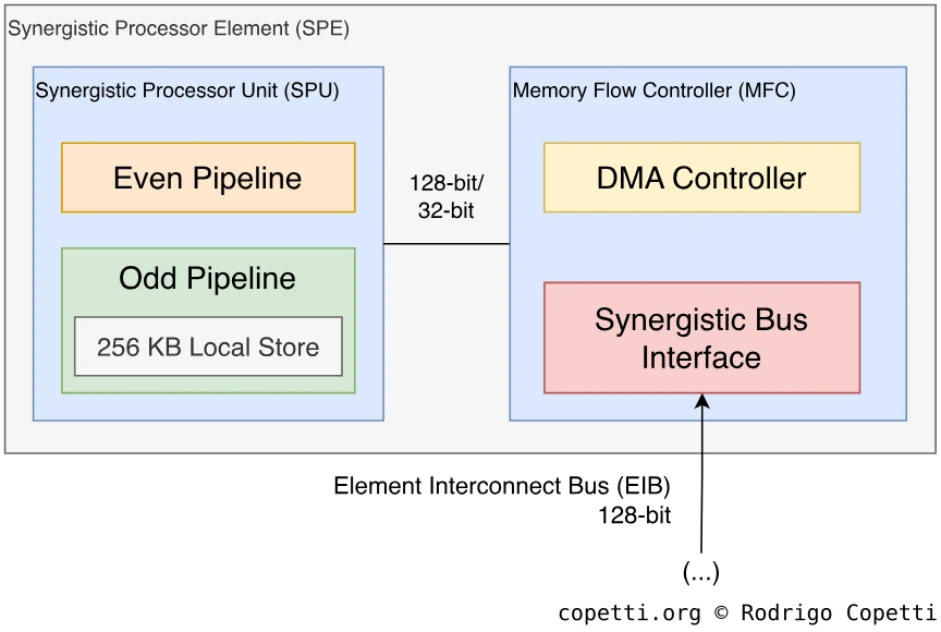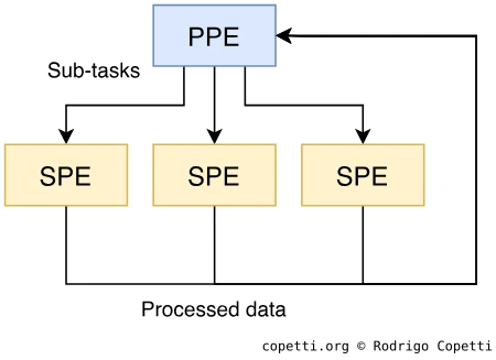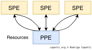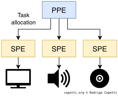 Вспомогательная: эта часть столь же важна, как и PPE, но возможности её элементов ограничены ролью помощника или ускорителя. Эта часть состоит из 8 блоков Synergistic Processing Element (SPE).
