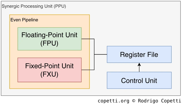 Начнем с того, что PPU не создан с нуля, а cтроится на основе существующей архитектуры PowerPC. Однако, в отличие от предыдущих итераций, когда IBM брала существующий процессор и немного обновляла его для соответствия новым требованиям, PPE не является преемником какого-либо предыдущего дизайна процессора. Вместо этого IBM создала новый процессор, который реализует спецификацию PowerPC версии 2.02 (это последняя спецификация PowerPC перед ребрендингом в ‘Power ISA’). Суммируя вышесказанное, можно сказать, что с этого времени вы не найдете такой же дизайн PPU ни в одном существующем чипе того времени. Но он имеет те же машинные коды, что и в других чипах PowerPC.