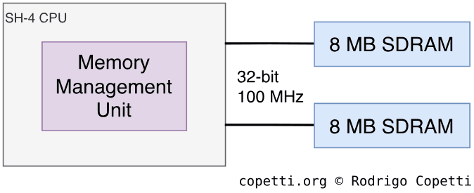 Dreamcast’lerde 16 MB SDRAM bulunur ve 100 MHz bus (CPU hızının yarısı) kullanılarak doğrudan CPU’ya bağlanır.
