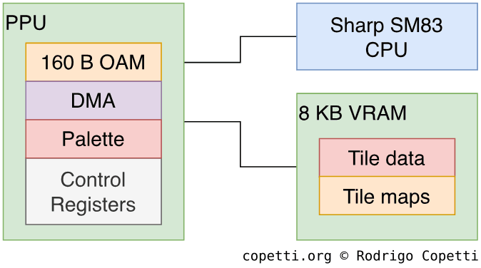 Memory architecture of the DMG (original Game Boy). As you can notice, the PPU arbitrates access to VRAM.
