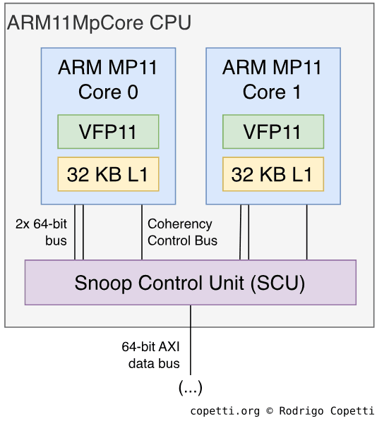 Finally, each core houses a co-processor called Vector Floating-point Coprocessor (also known as ‘VFP’, or ‘VFP11’ in the case of the ARM11). This accelerates arithmetic operations with floating-point numbers, both 32-bit single-precision (a.k.a. float) and 64-bit double-precision (a.k.a. double) ones [12]. It’s not a big coprocessor though, as its register file is composed of thirty-two 32-bit registers, so doubles will consume two registers. In any case, this processor implements the VFPv2 instruction set and follows the IEEE 754 standard. The latter is a welcomed decision, considering the difficulties of previous generations.