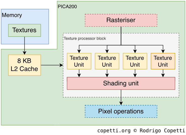 Now, there’s no more Tightly-Coupled Memory (TCM). There are however 16 KB of instruction cache and 16 KB of data cache, this change of model resembles other systems of the same generation. If you are curious, this L1 cache is 4-way set associative.