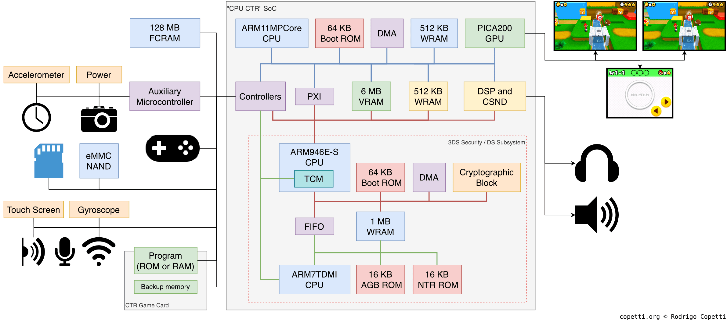 Generally speaking, the AXI model provides a set of protocols for connecting components with distinct bandwidth requirements. These are free to choose any particular topology, like the token-ring model of the PlayStation 3 or the mesh solution made for the Xbox 360. Now, within the Nintendo 3DS, we find a combination of bus and star designs.