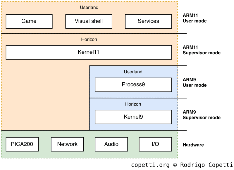 Notice how Gateway3DS is, for once, out of the equation. Be as it may, the Homebrew Launcher was still under the scope of userland (meaning homebrew apps could only access 64 MB of RAM and had no access to the audio DSP [125]).