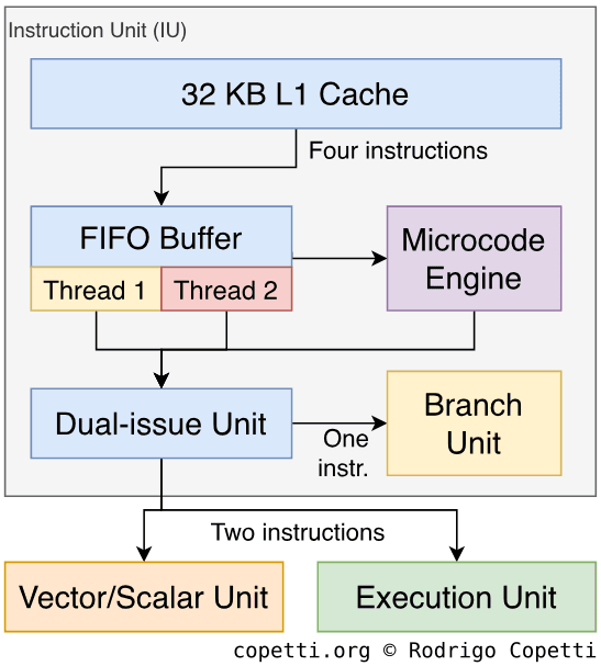Now for the interesting parts, The IU is dual-issued: in some cases, the IU will dispatch up to two instructions at the same time, consequently improving throughput greatly. In practice, however, there are many conditions for this to work, so programmers/compilers are responsible for optimising their routines so their sequence of instructions can take advantage of this function. By the way, dual-issuing has been implemented by previous CPUs as well, and the term varies between vendors, so here I used IBM’s definition.