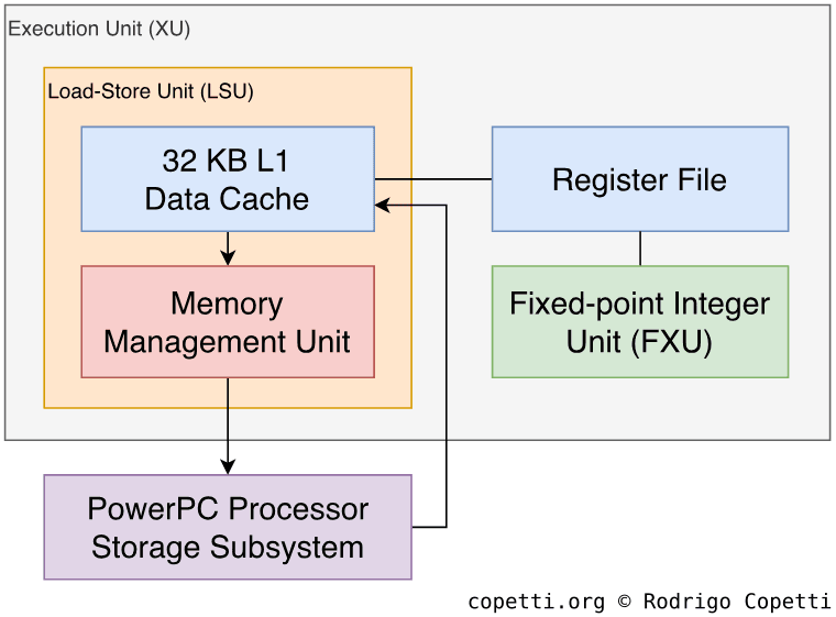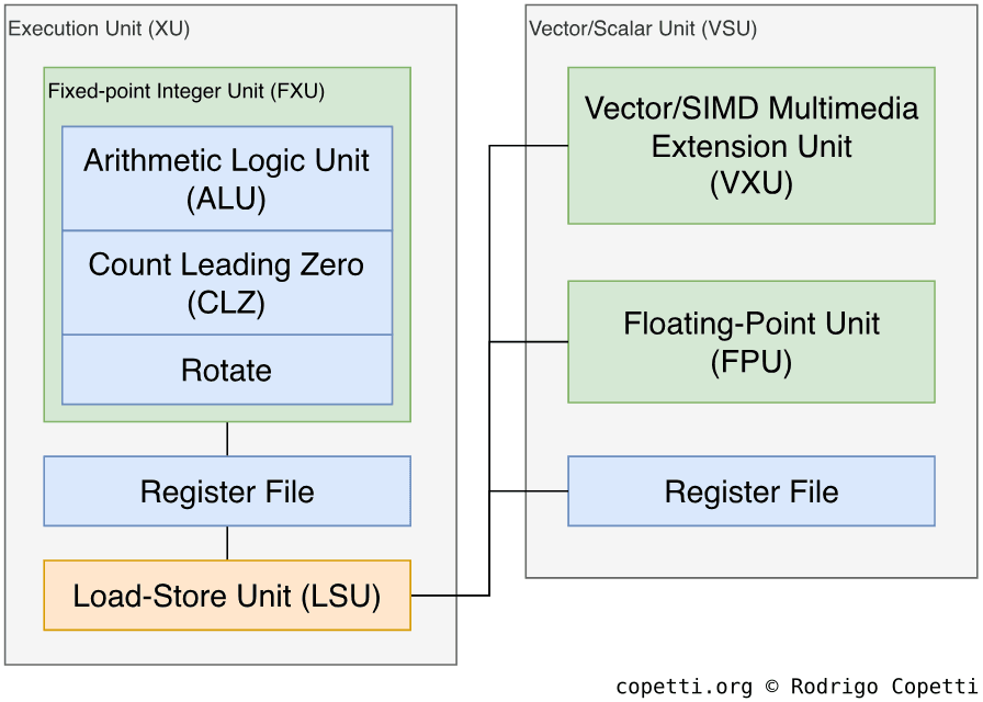 Furthermore, the LSU is coupled with a Memory Management Unit (MMU), which is a common occurrence in contemporary hardware. To make a long story short, the MMU handles memory addressing using a virtual address map combined with memory protection. To improve the latter, this MMU in particular features a segment unit, which groups memory addresses using ranges called ‘segments’. Now, to prevent performance degradation in the process, a Translation Lookaside Buffer (TLB) (caches converted addresses) and a Segment Lookaside Buffer (SLB) (caches segments) are included.