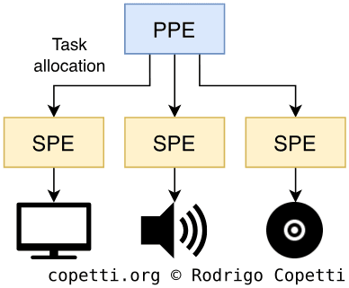 If you stop to think about it, both the PS1’s CPU and the Emotion Engine were already multi-core processors. So why was there so much fanfare about Cell? Well, the previous two chips were composed of one general-purpose core and several application-specific cores (i.e. audio processor, image decompression, etc) mixing different architectures, where the general-purpose core is in charge of commanding the others.