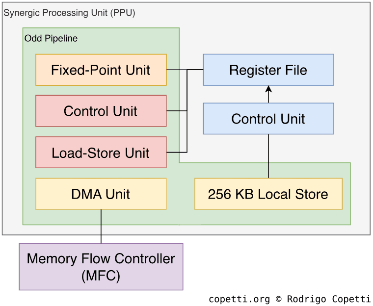 We are going to take a look at the insides of the PPU just now. To recap, we’ve dived into Cell, then into the PPE, and finally into the PPU. We’ll analyse the PPU just like any other CPU core.