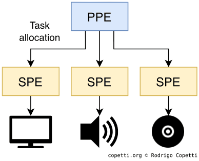If you stop to think about it, both the PS1’s CPU and the Emotion Engine were already multi-core processors. So why was there so much fanfare about Cell? Well, the previous two chips were composed of one general-purpose core and several application-specific cores (i.e. audio processor, image decompression, etc) mixing different architectures, where the general-purpose core is in charge of commanding the others.