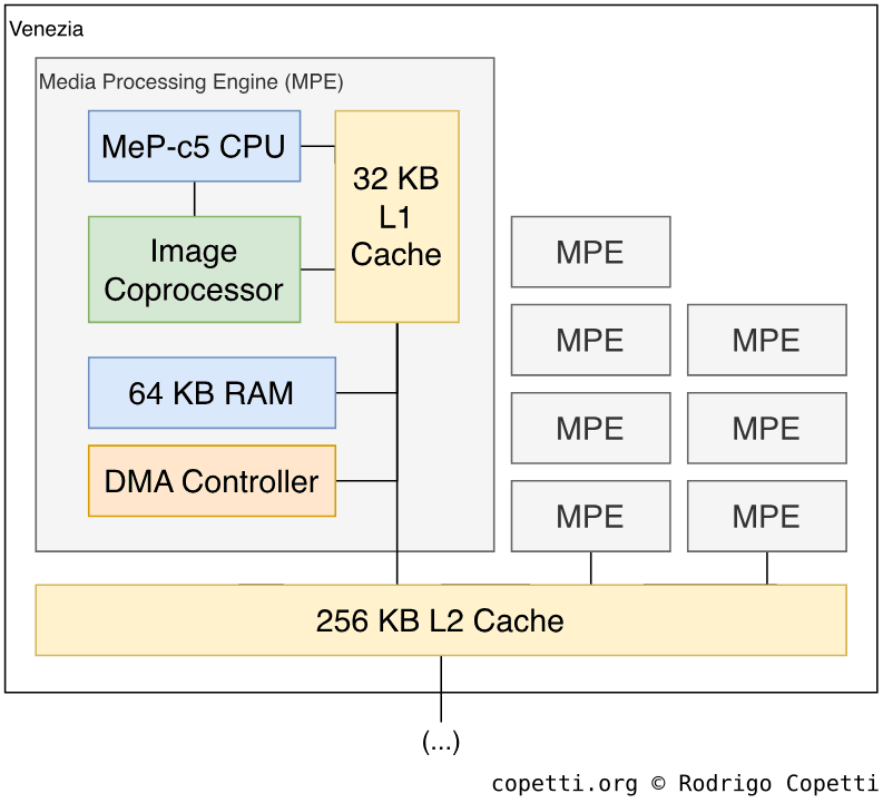Similarly to the MPCore, Venezia is a cluster, this time made of eight ‘Media Processing Engine’ (MPE) cores operating at 266.7 MHz. Notice that its naming confusingly overlaps with ARM’s vector accelerators, but they are different silicon. That being said, each of Toshiba’s MPEs houses [23]: