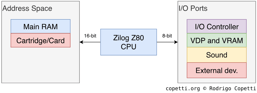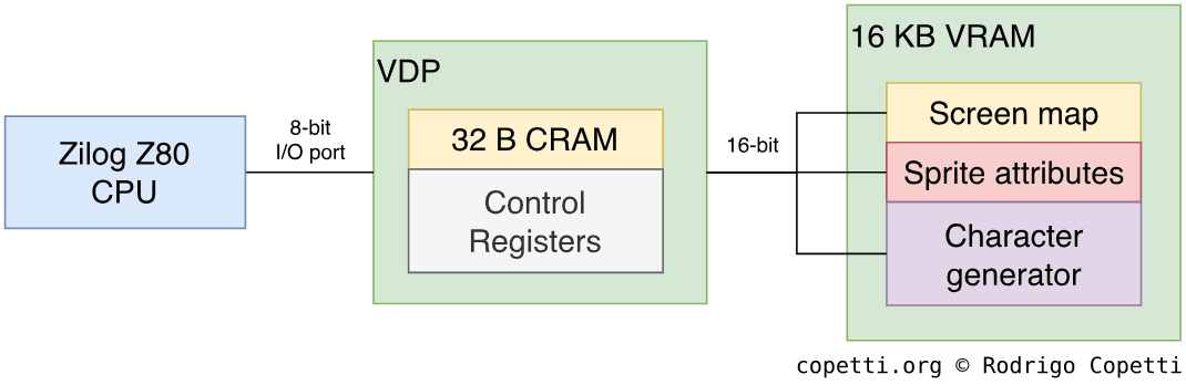 对于 SMS 而言,VRAM 存储了 VDP 渲染所需的所有数据(除了颜色 RAM)。 CPU 通过写入特定的 VDP 寄存器来填充 VRAM,这些寄存器随后会将值转发给 VRAM。 由于 VDP 是通过 I/O 端口访问的,CPU 必须使用 IN和 OUT 指令。