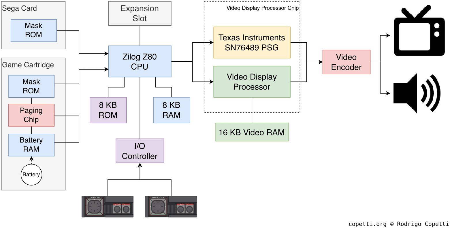 另一方面,SMS使用了一个专用的I/O控制器芯片,不仅用于接口手柄,还可以启用和禁用系统的一部分,这会改变地址映射。 此外,这个控制器对于支持FM扩展至关重要,因为FM模块暴露的端口与其他系统部分冲突(也就是说,如果没有I/O芯片的介入)。