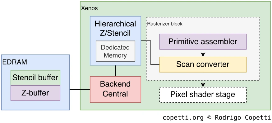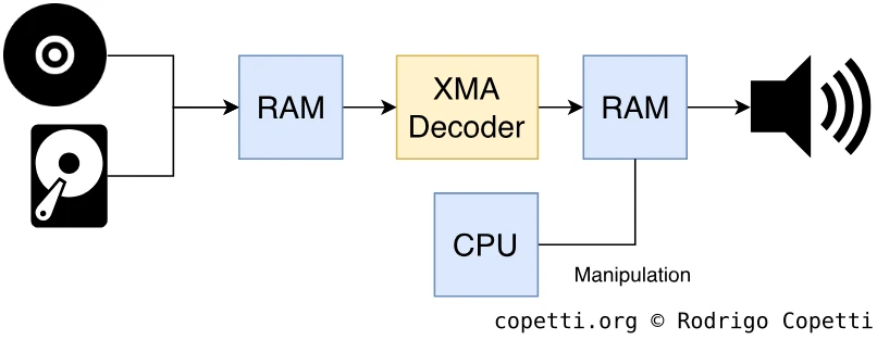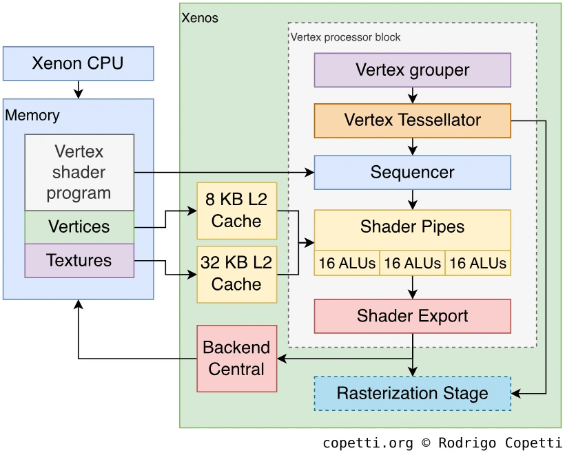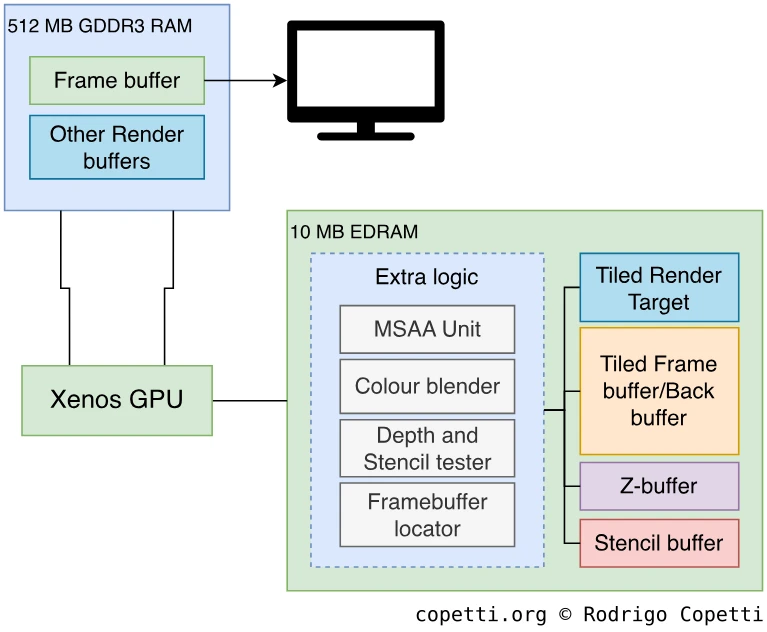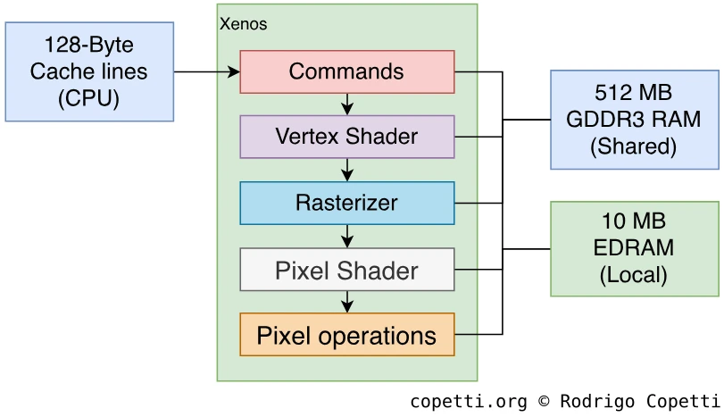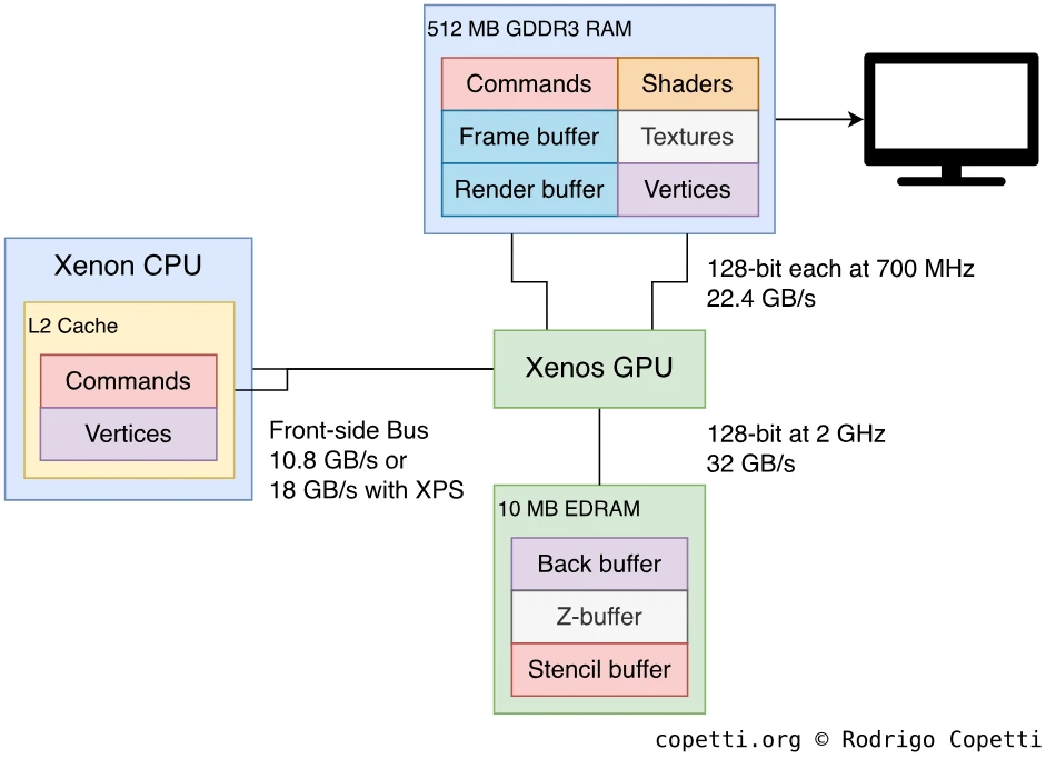 好吧…让我重新表述一下。 在主板上,多个芯片总共提供了512MB的GDDR3 SDRAM,但它们位于GPU旁边,而不是CPU旁边。 所以…你可能已经猜到了。 与初代Xbox一样,微软选择了统一内存架构(UMA)布局,其中所有组件共享相同的RAM芯片。 这提供了更大的灵活性,可以根据需要为CPU或GPU保留更多内存。 然而,对于各种组件来说,单一访问点意味着距离较远的组件(如CPU)将遭受比假设CPU有专用内存时更高的延迟。 这一点被IBM和微软的工程师注意到,并随后通过前述的L2缓存以及额外的电路(这将在“图形”部分解释)来解决这个问题。