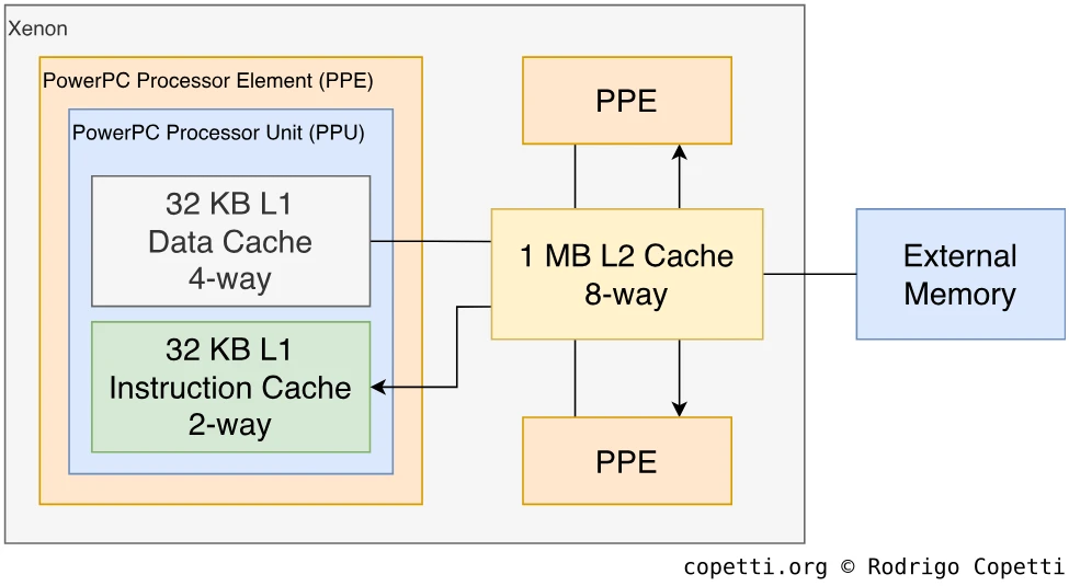 Cell项目,因其对向量化计算的痴迷,引入了非常有趣的方法来彻底解决阻碍技术进步的持续限制。 然而,这些限制非常复杂。 因此,说Cell的方法是最好的解决方案,甚至是不公平的。 换句话说,通过研究Xenon的架构(它与Cell一起竞争)我们可以获得不同的视角,了解CPU架构在那个时代(21世纪初)是如何发展的,并随后影响了接下来十年的CPU。