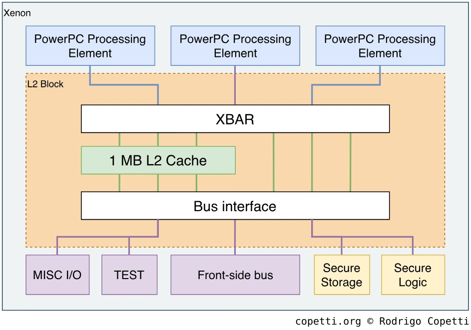 公平地说,到目前为止,我只谈到了连接PPE的特定接口。 好吧,XBAR只是IBM为Xenon设计的庞大块状结构中的一部分。 事实证明,剩余的空间让他们有机会整合另一个非常重要的块,以加速PPE与系统其他部分之间的交易:L2缓存。
