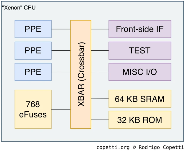 原始芯片(Cell)需要容纳十二个独立节点来积极移动数据,这迫使IBM工程师设计了一个复杂的系统,以解决出现的瓶颈问题,这个系统就是元件互连总线(EIB)。 而在Xbox 360中,Xenon只需要容纳三个单元(三个PPE),所以EIB在这里没有用途。 因此,产生了一个更简单的解决方案,称为XBAR,专门关注这三个PPE,并留有空间以增加额外功能。