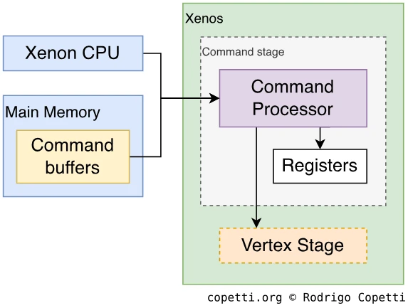 此外,VMX128增加了新的指令,可以计算由多达三个32位浮点数组成的两个向量的点积;以及其他处理Direct3D数据压缩格式的指令[10]。值得注意的是,DirectX是这个游戏机编程的唯一API。 最后,由于Xenon的对称设计及其多线程模型(双发射),VMX128的寄存器文件被复制,因此每个核心有256个128位寄存器!