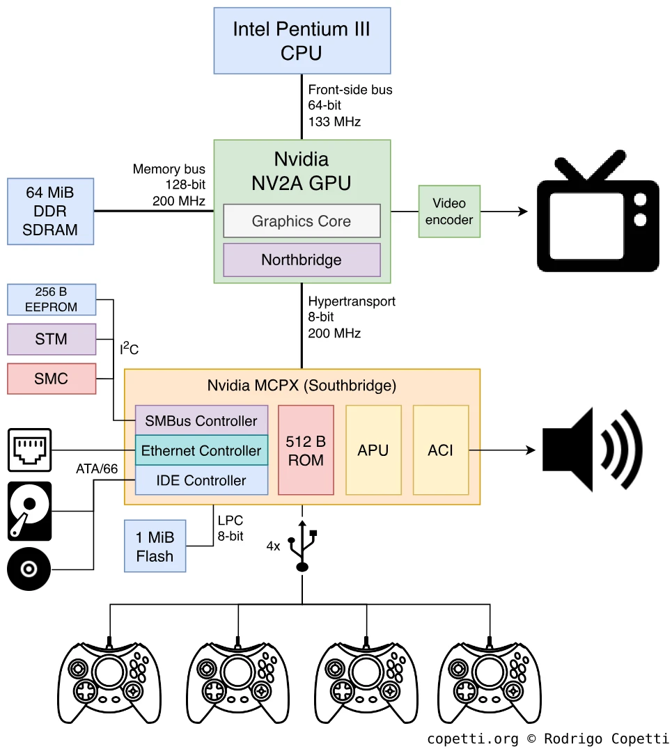 这款游戏机所含的处理器是著名的英特尔奔腾III(Pentium III)(一种用于电脑的货架CPU)的略微定制版本,运行频率为733 MHz。 由此可以推测,这款游戏机背后只是一台个人电脑… …我不会告诉你答案,但我保证,在文章的最后,你一定能得出自己的结论。
